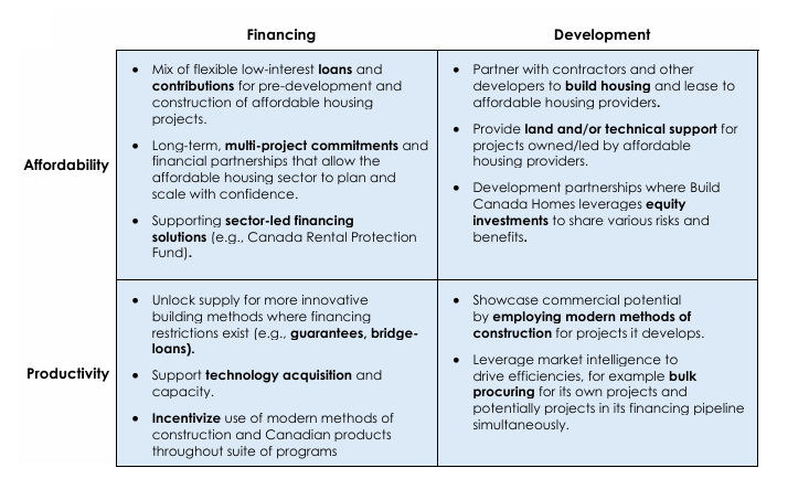 Build Canada Homes will be Canada’s new federal entity responsible for building affordable homes, providing financing to affordable home builders, and catalyzing a more productive homebuilding industry. It will bring together key partners from across the housing ecosystem to get homes built by addressing barriers, reducing risk and helping to navigate the process of building non-market housing.