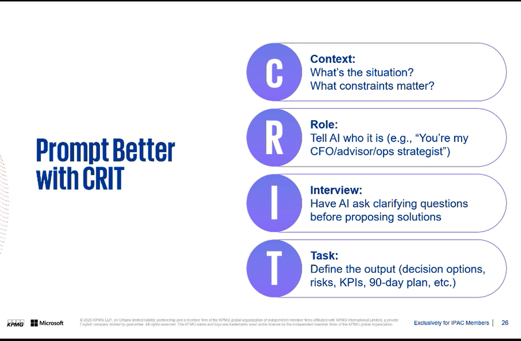 A helpful acronym for your AI prompts from our friends at Microsoft and KPMG: |