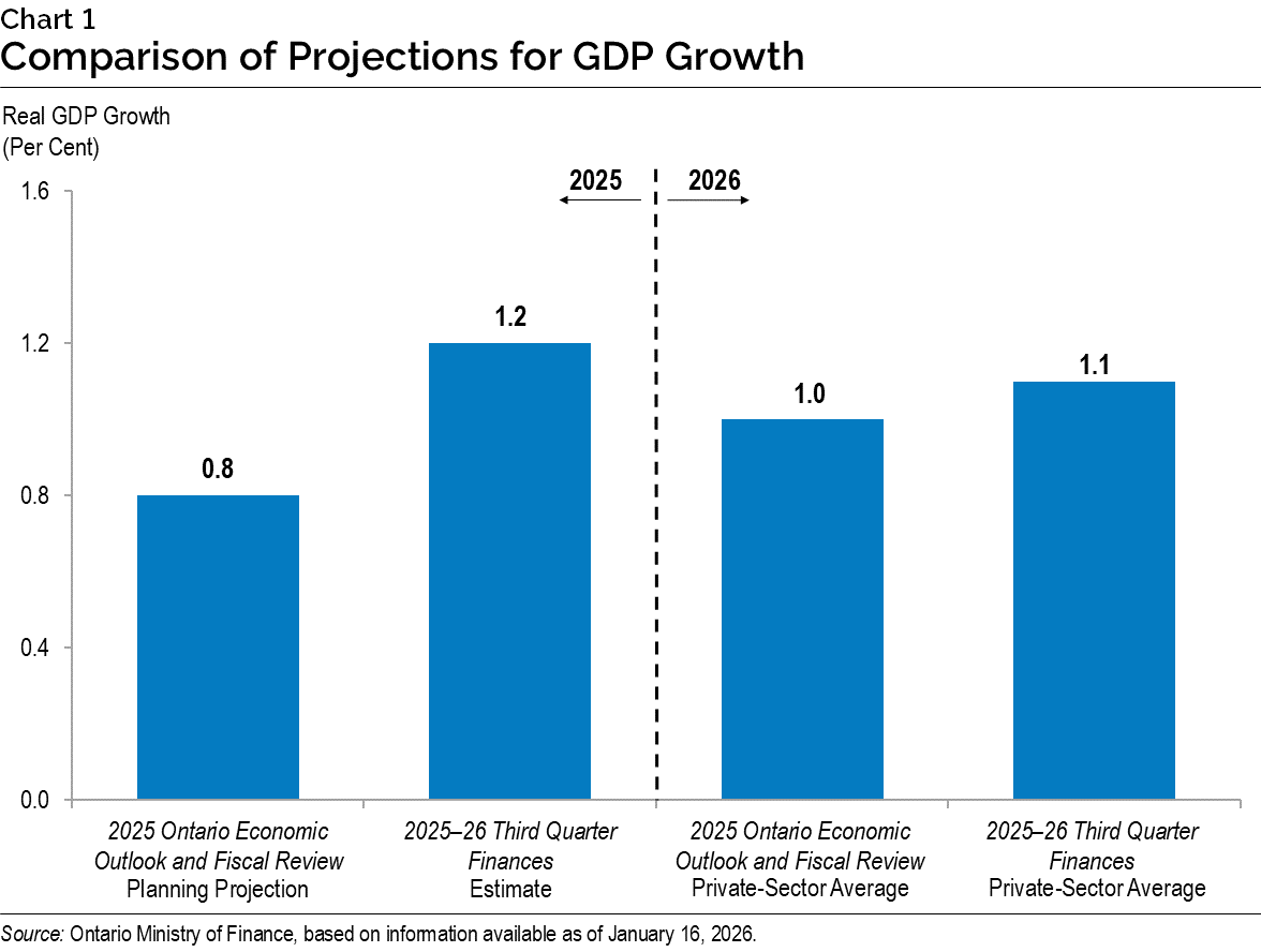 Ontario’s real gross domestic product (GDP) increased 0.5 per cent in the third quarter of 2025, following a 0.7 per cent decline in the second quarter. Ontario’s real GDP rose by an estimated 1.2 per cent in 2025, which is higher than projected at the time of the 2025 Ontario Economic Outlook and Fiscal Review, while the private-sector average projection for real GDP growth in 2026 has increased slightly to 1.1 per cent. As of the 2025–26 Third Quarter Finances, the province’s 2025–26 deficit is projected to be $13.4 billion—an improvement of $0.1 billion compared to the 2025 Ontario Economic Outlook and Fiscal Review. The 2025 Budget, published in May 2025, projected a deficit of $14.6 billion. |